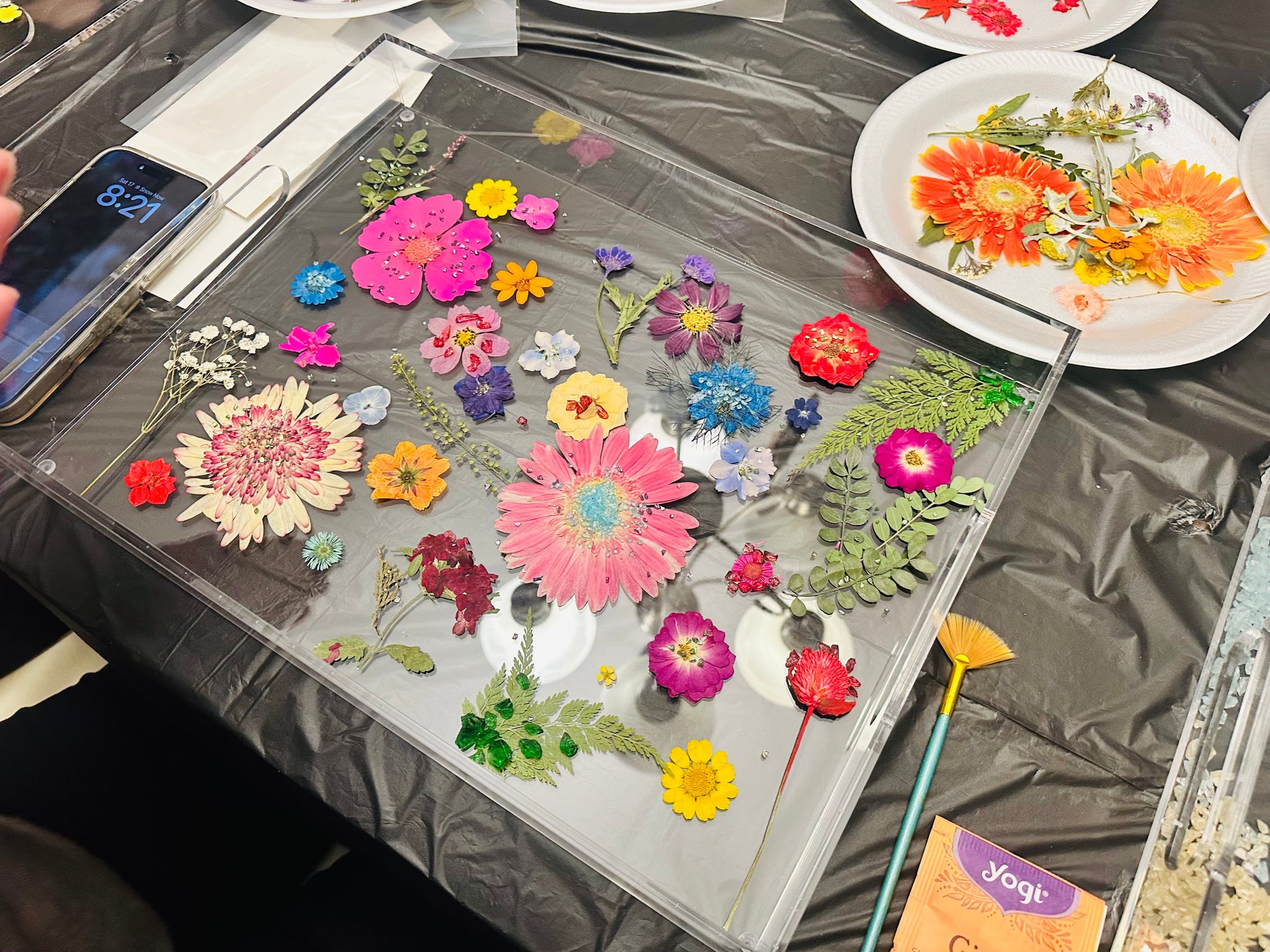 You can choose to do any of these designs or make up your own! I will have lots of colors of crushed glass, glitter, and pressed flowers! You can also bring your own crystals and jewelry additions too! Let me know if you have a plan for a certain color scheme so I know to have plenty of a certain color on hand.