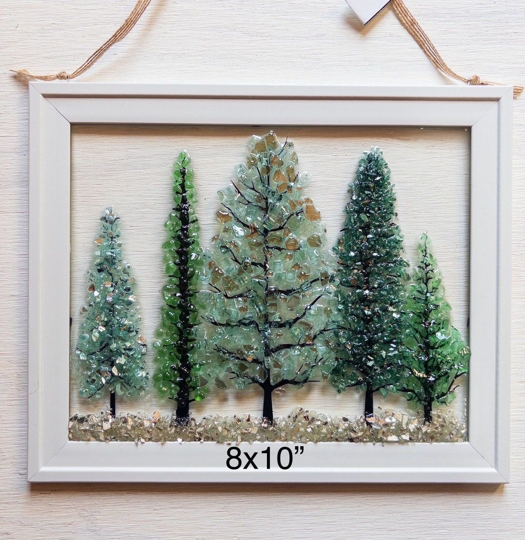 I will make my sample based on these fun ideas. The style of trees will be an option. We will paint the tree trunks on the back of the 11x14 plexiglass and then add the crushed glass and decorative accents on the front, lastly we will seal it with epoxy.